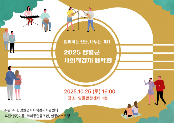 2025 영월군 사회적경제 음악회 초대합니다. 페이지 정보 작성자 : 관리자 작성일 : 2025-10-22 조회 : 44회 관련링크 본문 2025 영월군 사회적경제 음악회 안내'함께하는 선율, 나누는 가치'를 주제로 사회적경제 음악회를 개최하오니 많이 참석하시길 바랍니다.- 일시: 2025. 10. 25. (토) 16:00- 장소: 영월관광센터 1층- 행사 내용: 음악회, 사회적경제기업 제품 체험, 마술쇼 이전글 다음글 목록